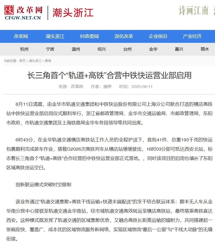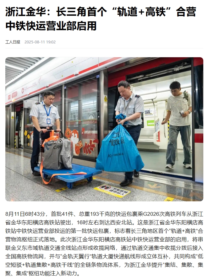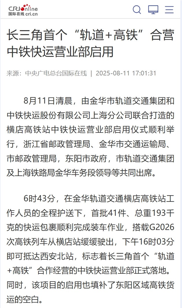 8月11日,長(zhǎng)三角首個(gè)“軌道+高鐵”合營(yíng)中鐵快運(yùn)營(yíng)業(yè)部啟用。該營(yíng)業(yè)部將串聯(lián)金義東市域軌道交通全線站點(diǎn)形成收攬網(wǎng)絡(luò),在全線31座車站均可辦理業(yè)務(wù),通過軌道交通集中收攬分撥后接入全國(guó)高鐵物流網(wǎng)。